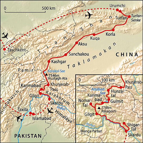 Die Reise beginnt in Urumchi und führt in die Turfan-Senke, die bis zu 150 Meter unter dem Meeresspiegel liegt. Von hier aus folgen wir der nördlichen Seidenstraße entlang der Wüste Taklamakan und kommen vorbei an alten buddhistischen Klöstern bis in die alte Oasenstadt Kashgar. Auf dem legendären Karakorum Highway führt die Fahrt über den Khunjerab-Pass nach Nordpakistan. Hier offenbart sich uns eine einzigartige Bergwelt, wo die gewaltigen Gebirgszüge Hindukusch, Karakorum und Himalaya zusammentreffen. Diese Region beheimatet die Hälfte der höchsten Berge der Erde und ist Schatzkammer alter Kulturen und religiöser Überzeugungen. Jeder Kilometer auf dem Karakorum Highway bietet atemberaubende Ausblicke und ermöglicht Begegnungen mit tief verwurzelten Traditionen, die in unserer modernen Welt selten geworden sind.
